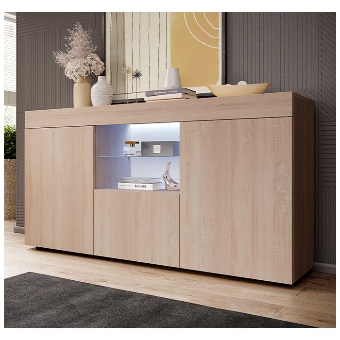 Dit stijlvolle dressoir is een aanwinst voor iedere kamer. Het meubel heeft twee deuren en één lade, deze openen en sluiten met het handige druk- en kliksysteem. In het open opbergvak zit een glazen plaat met daarbij LED-verlichting, dit zorgt voor een zeer moderne uitstraling. Het dressoir is gemaakt van mat melamine.