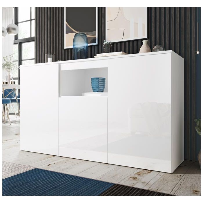 Dit simpele, toch stijlvolle, dressoir biedt meer dan genoeg ruimte. Model Nevada beschikt over drie deuren, die te openen zijn via een handig druk- en kliksysteem. Daarnaast is er een open ruimte die ook ideaal te gebruiken is voor voor decoratieve voorwerpen. De structuur van dit meubel is gemaakt van glanzend melamine.