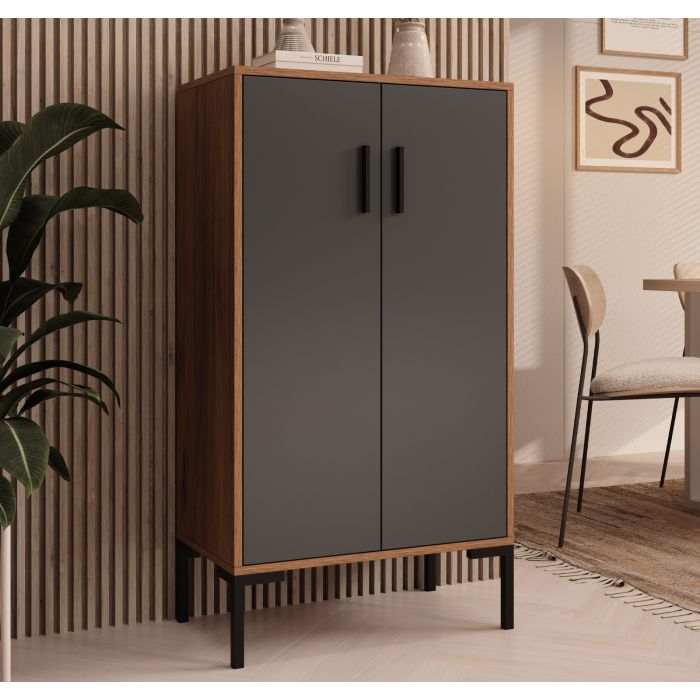 Moderne en multifunctionele opbergkast. Het heeft een aantrekkelijk ontwerp waardoor het geschikt is voor allerlei ruimtes. Je kunt het gebruiken als dressoir in de woonkamer of keuken, maar ook als boekenkast, commode, bijzetmeubel, opbergruimte in de hal of op kantoor. Het bestaat uit twee compartimenten met deuren voor het opbergen van huishoudelijke spullen, boeken, mappen, kleding, enz. Op het royale bovenblad kun je decoratieve elementen, voorwerpen die je bij de hand moet hebben of keukenapparatuur plaatsen. Dit meubel is vooral geschikt voor kleine ruimtes, waar een opgeruimde en goed ingedeelde omgeving erg belangrijk is. Een meubelstuk met een minimalistisch ontwerp dat een praktische en decoratieve toevoeging aan je huis zal zijn.